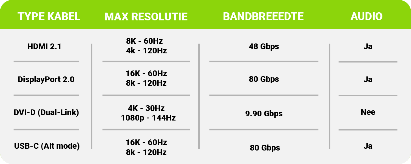 De tabel hierboven laat zien wat de maximale mogelijkheden per kabeltype zijn, maar dat betekent niet dat je die bandbreedte altijd nodig hebt. Welke kabel je kiest, hangt af van de resolutie en verversingssnelheid (Hz) van je monitor. Maar als je zeker goed wil zitten kan je ook de port versie van je monitor checken en dan zit je meestal ook goed met de maximale verversingssnelheid van je monitor.