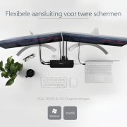 Met flexibele dual videocombinaties biedt dit universele laptop docking station externe HDMI-, DVI- en VGA-schermuitgangen. Elke video-uitgang ondersteunt HD-videoresoluties (max. 2048x1152) en HD-videoplayback en is zo de ideale oplossing voor het uitbreiden van de videocapaciteit van uw notebook.